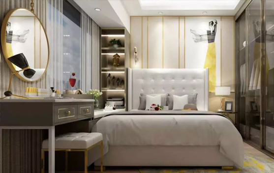 人三分之一的時間都是在臥室度過,臥室是很多業主最關注的空間。 上圖整個房間以米色調為主,點綴優雅藍,溫暖柔和的顏色,搭什么都出彩。墻面做了紫鳶花的主背景,紫鳶花的花語是對伴侶的仰慕,寓意著夫妻間的相互欣賞和成長,對愛情美好的憧憬。在軟裝的搭配下,主臥的整體設計感非常理想。
